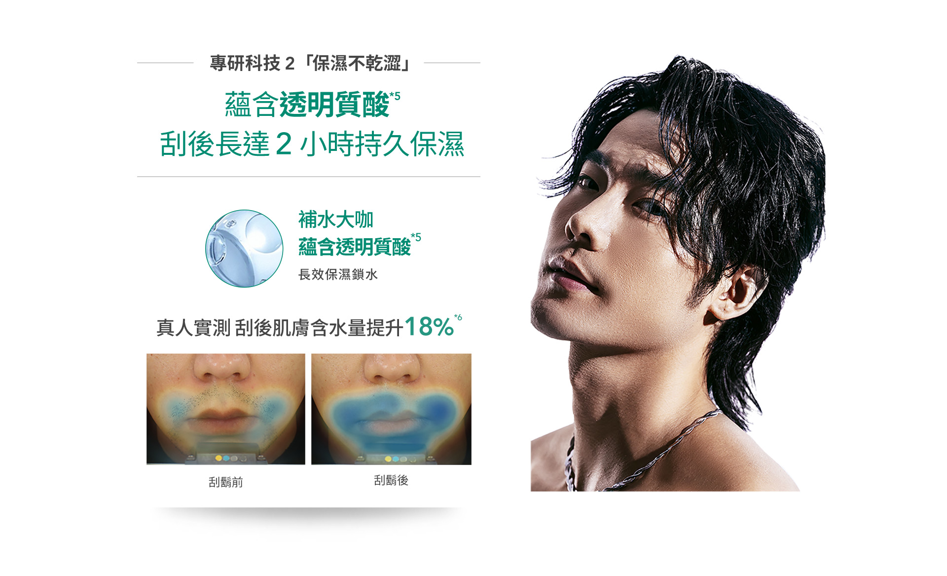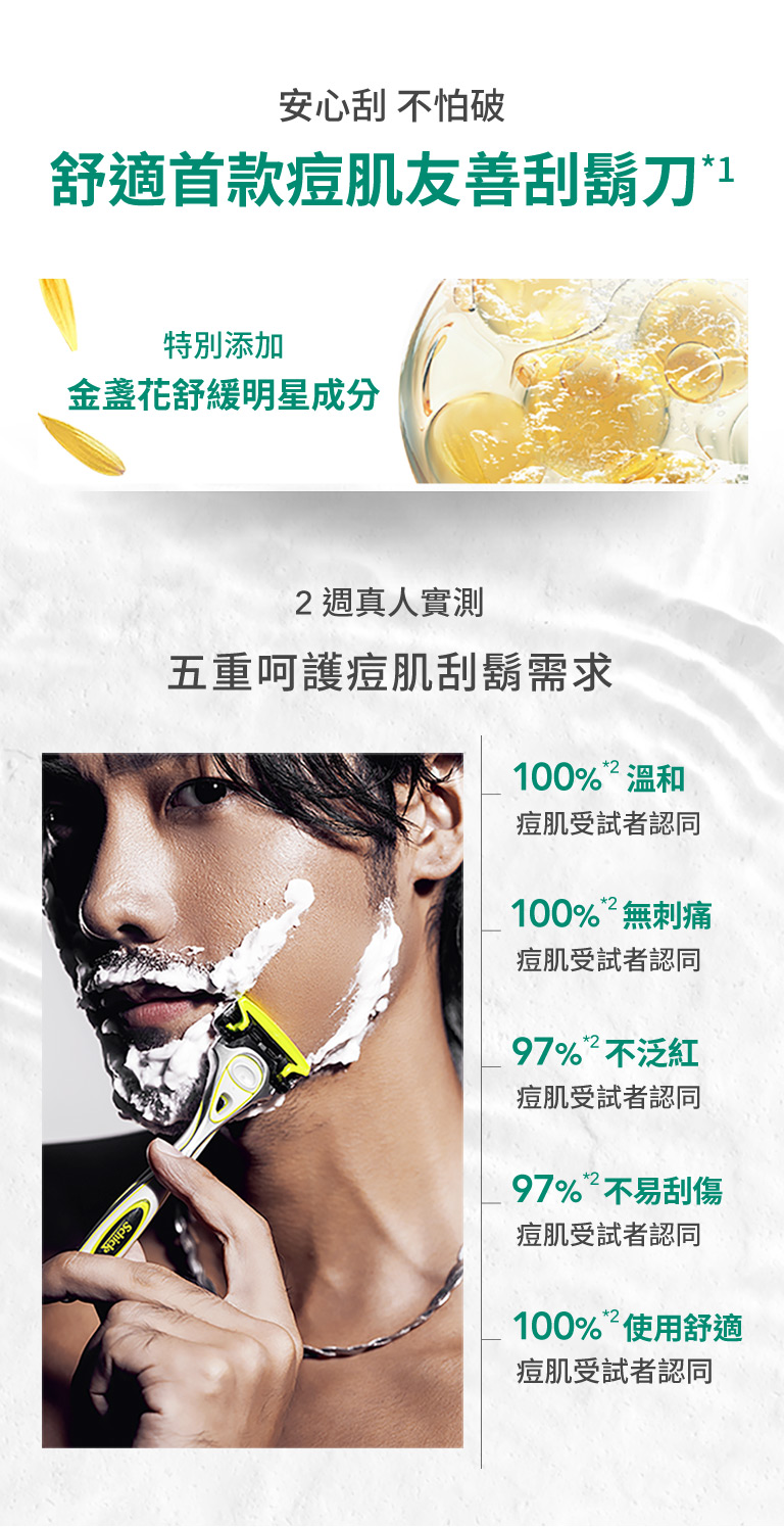 安心刮 不怕破 舒適首款痘肌友善刮鬍刀 添加玻尿酸保濕凝膠減少40%肌膚磨擦 蘊含透明質酸刮後長達2小時持久保濕 添加金盞花減少56%刮後泛紅 美國進口 5層刀厚度 -10%更鋒利 滿分手感舒適刮淨 舒適刮淨只需簡單6步驟 建議2-3個月更換刀頭 水感零摩擦, 舒適輕鬆擦 說明